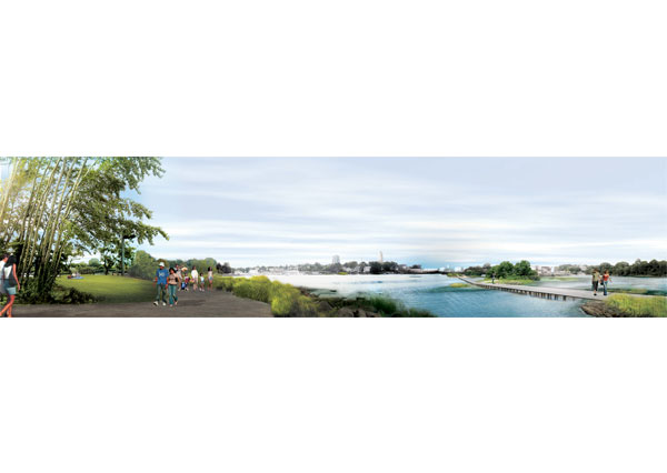 An extensive network of paths, some robust and permanent, and others delicate and floodable, will connect The Armory Portal to Five Island Parks. Surface trails link to the waterfront and lead visitors through island trails and along sandy beaches.