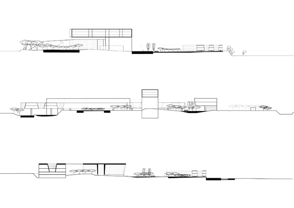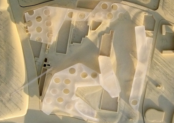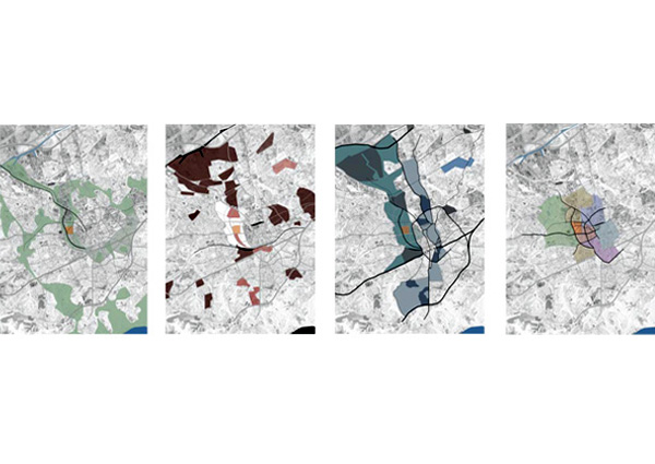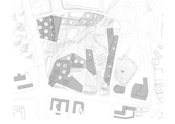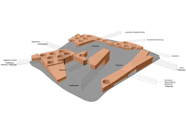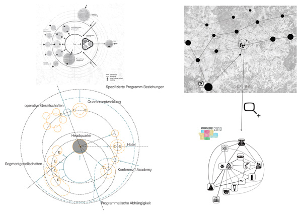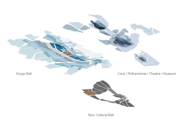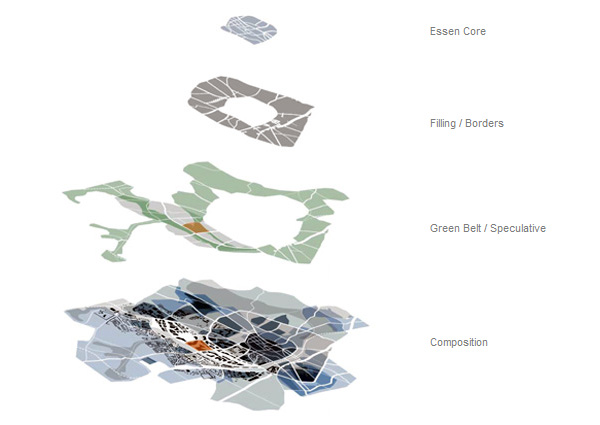 Strategy: Essen is a nodal point of culture and commerce in a broader field of urban constellations within the Ruhrgebeit. The region is a series of belts mitigated by points of increased density strung along the Rhine River. The city itself is a fabric of concentric bands zoned in distinct precincts or "episodes" emanating from the old town. In juxtaposition to this order, the Krupp Belt, as with other swaths of programmatic linkage, simultaneously defines and erodes distinct boundaries. The site is an opportunity to bridge the residential districts outlying the city and the infill zones of commercial and cultural activity.