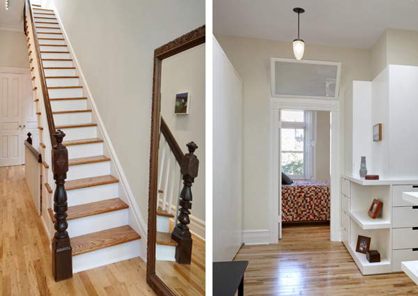 While the exterior of the building was largely untouched, a custom front door was designed to accommodate the need to maintain security and to allow for ventilation through the entire house. A waterjet-cut steel grill and welded frame in powder-coat finish, solid Ipe hardware panel, and custom Nanz hardware was used to create an inviting but secure entrance to the house from the street level. An operable interior door panel allows for ventilation without opening the door or implementing a screen.