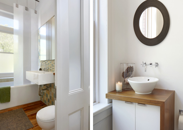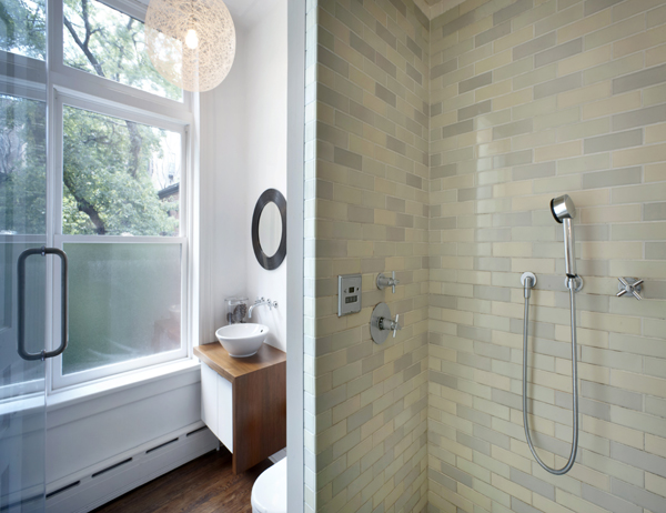 Two new bathrooms were added, and include a tub, a shower with a window, and a steam shower. All fixtures were replaced with custom millwork and tiles. The kitchen appliances were replaced with a Miele downdraft cooktop and dual ovens and a refinished sub-zero refrigerator. Throughout the house, the treads and risers of the entire stair and hallways were replaced with stained maple to match the ground floor. The flooring was redone with a new reclaimed wood from character-grade maple flooring from an old tobacco barn.